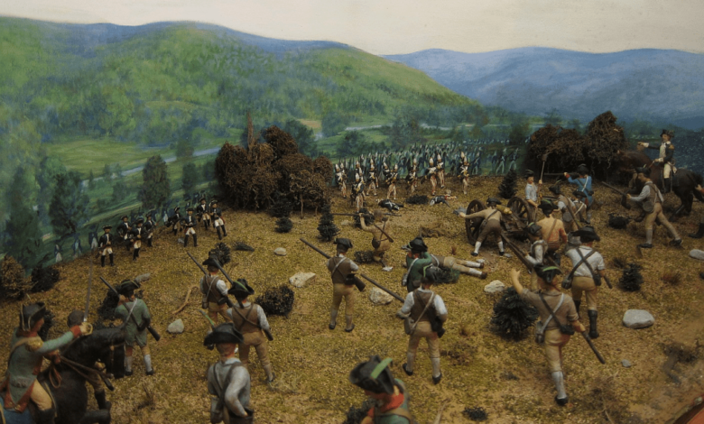 diorama of the battle of Bennington at the Bennington Battle Monument, Seth Warner leads Green Mountain Boys troops on the rightdiorama of the battle of Bennington at the Bennington Battle Monument, Seth Warner leads Green Mountain Boys troops on the rightIn mid-August these two relatively mi­nor forces collided, somewhat acciden­tally, in the tiny valley of the Walloomsac River, in the extreme northeastern corner of Rensselaer County, New York.