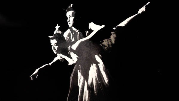 A black and white photo of two dancers.