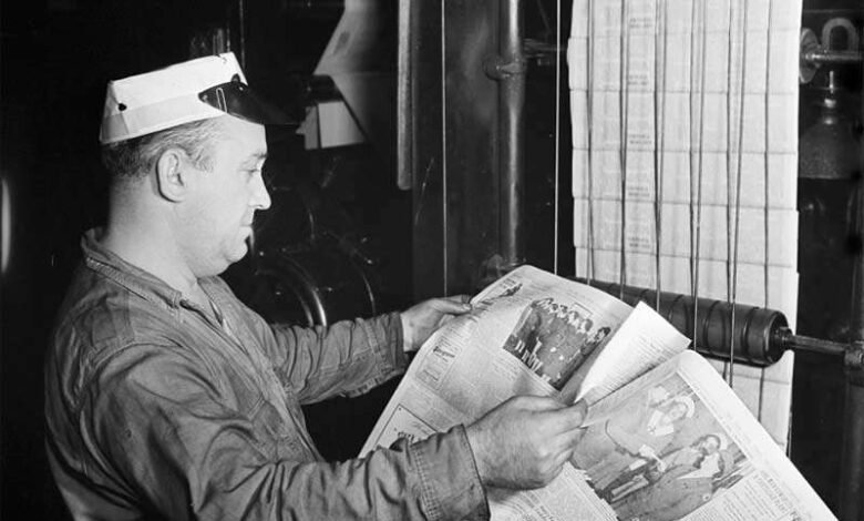 Photo: A New York Times pressman checking a newspaper for defects in 1942.