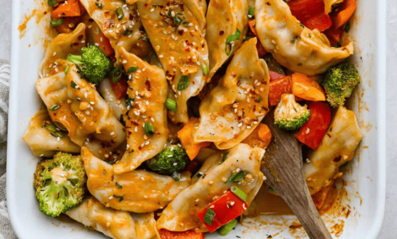 2. Arrange the Potstickers and Veggies: Arrange the potstickers in an even layer at the bottom of the baking dish, then distribute your choice of veggies over the top.