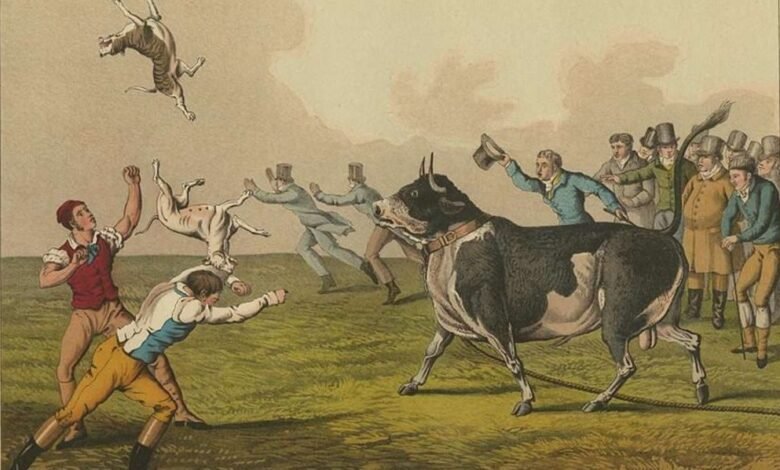Illustrations, from above: “Bull Baiting” by J. Clark, 1820 (London); Bear-baiting in the 14th century (British Library); badger-baiting in London, ca. 1823; “Terrier Dog Major ratting,” by an unknown 19th century artist (Major was known to have killed 100 rats in 8 minutes, 58 seconds); “A Gander-Pull” illustration of a live goose pulling in 19th-century West Virginia by Frederic Remington; and a bear and bull fight in New Orleans in 1853.