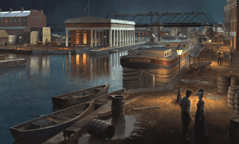 Illustration: Len F. Tantillo’s “The Weighlock, Albany, NY, 1880,” oil on canvas, 32 x 48 inches, 2024.